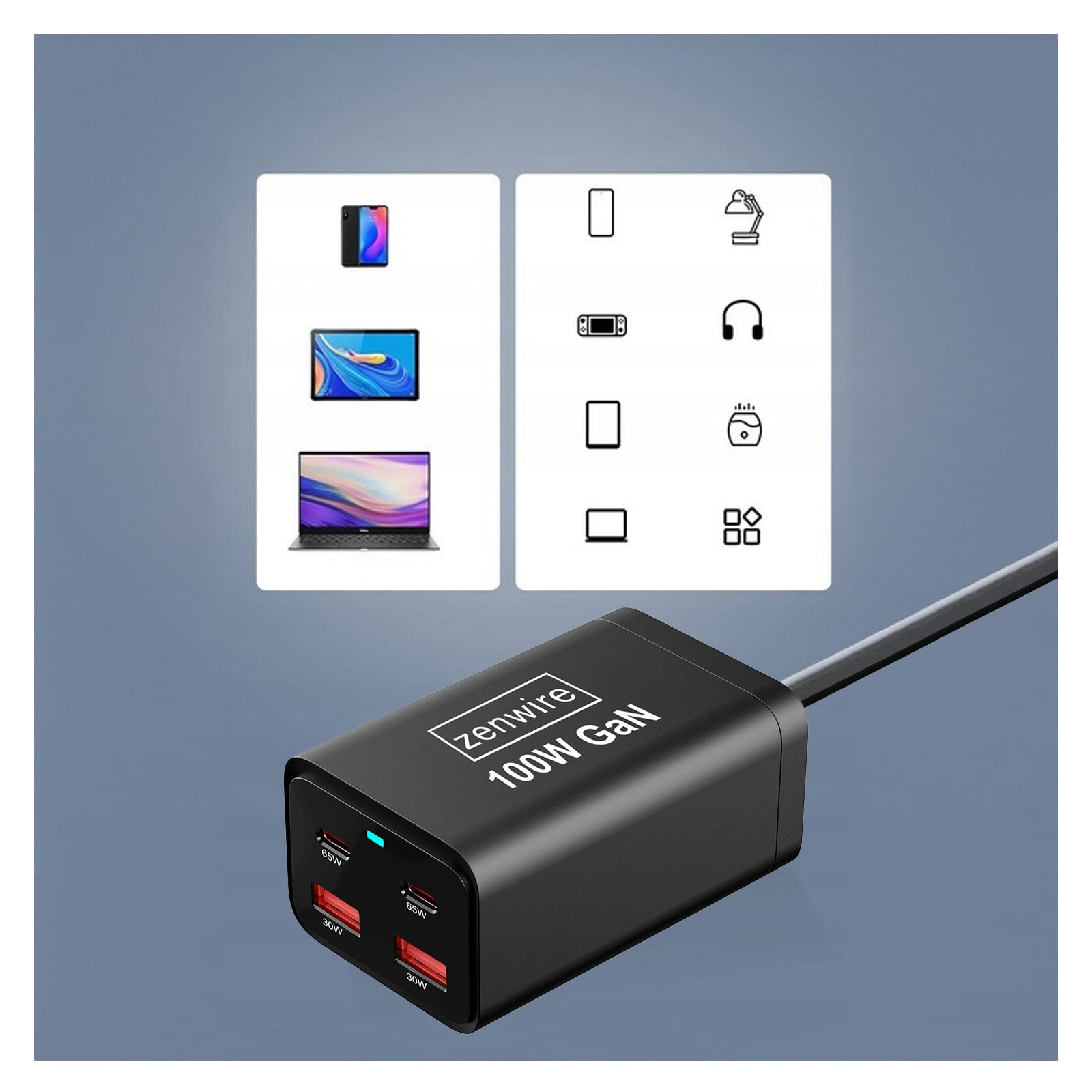 - Vysoký výkon 100 W - Nabíjačka Zenwire poskytuje rýchle nabíjanie až štyroch zariadení súčasne, ako sú notebooky, smartfóny, tablety, čo umožňuje rýchle nabíjanie aj väčších zariadení v krátkom čase.
